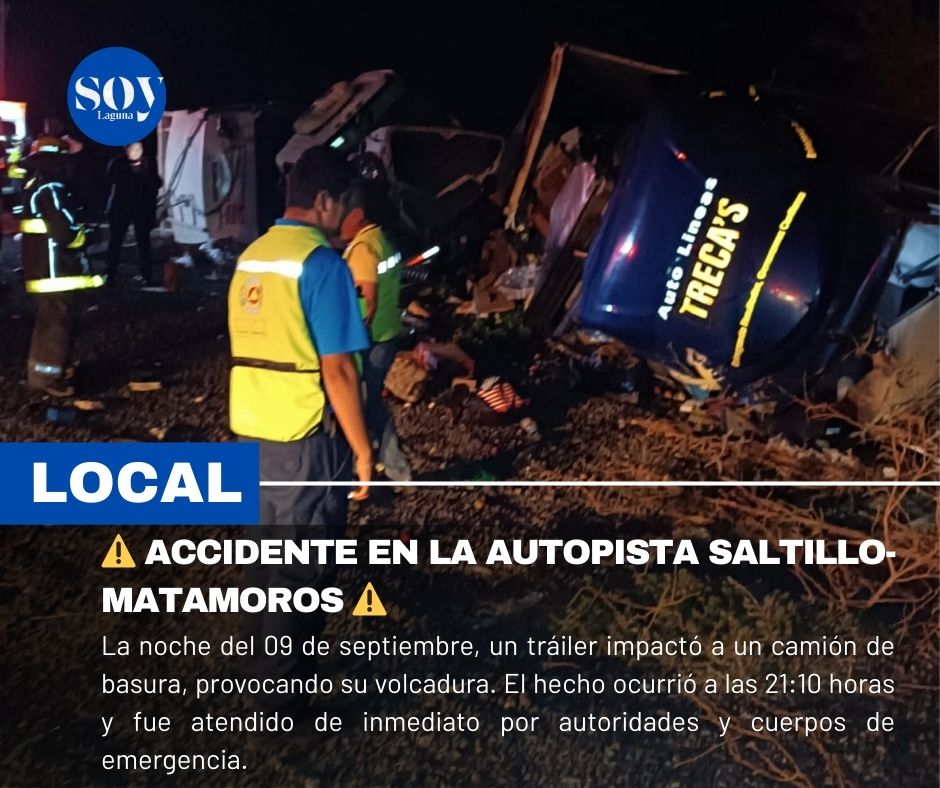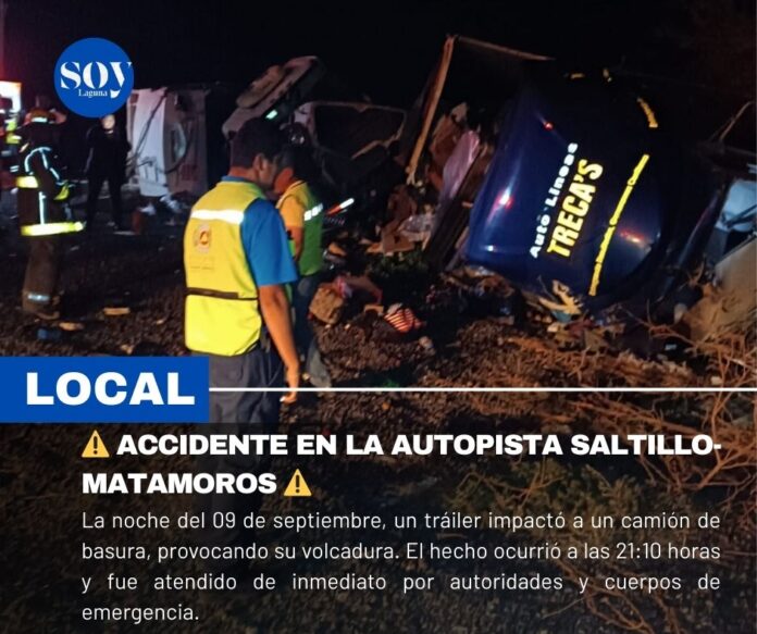 La noche de este martes, un tráiler impactó a un camión de basura, provocando la volcadura del vehículo sobre la Autopista Saltillo-Matamoros, a la altura de Matamoros. El incidente ocurrió alrededor de las 21:10 horas.