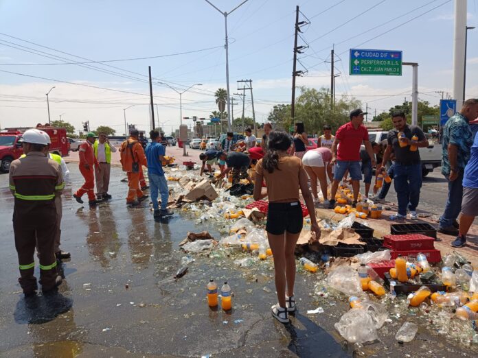 Torreón, Coahuila; 22 de agosto de 2025. – La mañana de este viernes, un tráiler que transportaba diversas bebidas sufrió un accidente sobre Boulevard Juan Pablo, en la colonia Miguel de la Madrid, lo que provocó la caída de 28 tarimas con refrescos, jugos y otros productos.