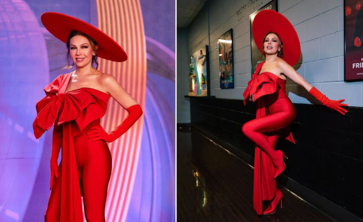 1. El outfit rojo de Thalía: En la alfombra roja, Thalía deslumbró con un conjunto rojo vibrante de la marca Sadek Majed. El top cruzado, adornado con un enorme moño, destacó por su estilo único. Completó su atuendo con un sombrero XL, tacones puntiagudos y guantes de ópera rojos. Manteniendo las joyas al mínimo, optó por unos discretos aretes de la marca Lisa Nik Jewelry, permitiendo que su conjunto rojo se llevara toda la atención.