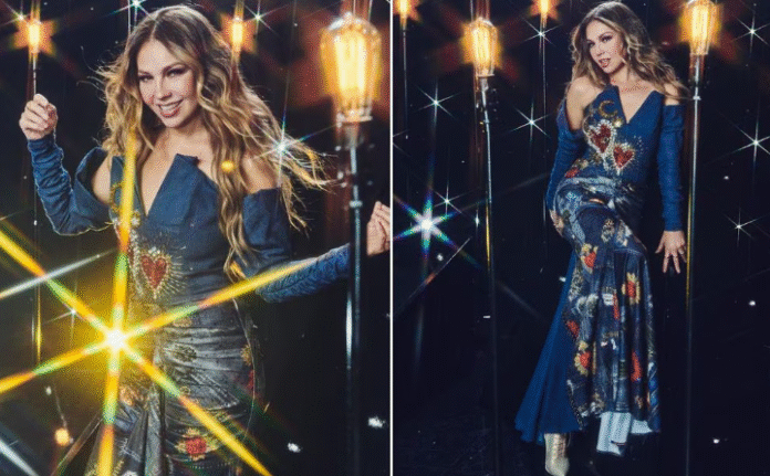 2. Outfit futurista: Para la presentación del remix de su canción «Te va a doler», Thalía optó por un look metalizado con un toque futurista. El diseño, con un escote profundo que mostraba su ombligo, brilló en el escenario mientras la artista deslumbraba con sus movimientos de baile rodeada de bailarinas.