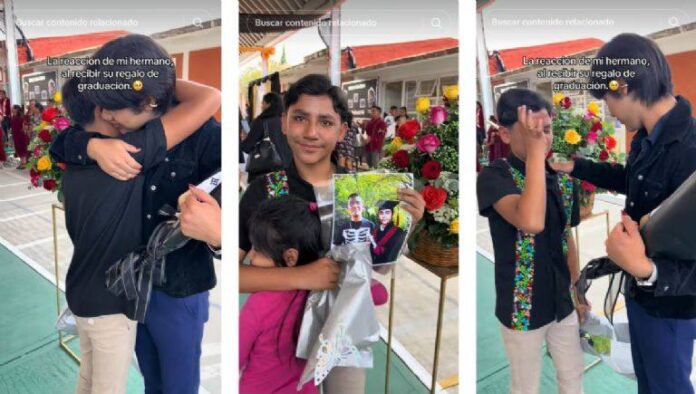 El momento fue captado en video y se volvió viral en TikTok. Se ve a una familia sencilla, vestida con dignidad y emoción para celebrar el logro del menor que se graduaba. Pero la silla vacía —la de su padre— pesaba más que cualquier logro académico. Y entonces, su hermano mayor se acercó, con los ojos cristalinos, y le entregó la fotografía: una edición en la que el niño aparece con su toga, al lado de su papá, como si aún estuviera ahí, orgulloso, acompañándolo.