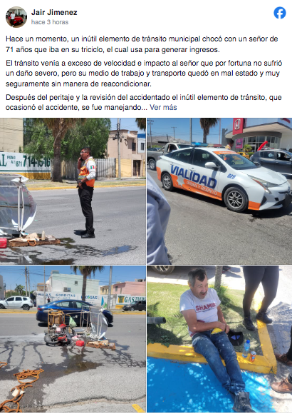 «El elemento de Tránsito venía a exceso de velocidad e impactó al señor, que por fortuna no resultó gravemente herido, pero su herramienta de trabajo quedó inutilizable», se lee en una de las publicaciones difundidas por ciudadanos en redes sociales.