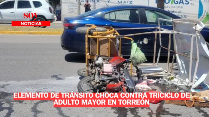 La tarde de este viernes se registró un accidente vial en la ciudad de Torreón, donde se vio involucrado un elemento de Tránsito Municipal y un hombre de 71 años que se desplazaba en un triciclo.