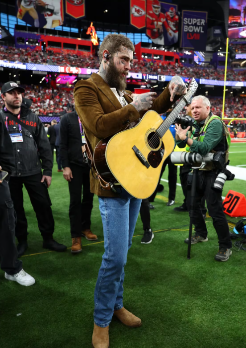 Post Malone, en un estilo informal acorde a su performance, destacó con un contraste entre tonos y texturas suaves. Kyle Juszczyk, con una campera alusiva a su equipo, y Richie James, con un look llamativo en tonos naranja, también atrajeron la atención con sus estilos únicos.