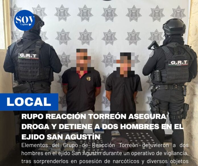 Elementos del Grupo de Reacción Torreón detuvieron a dos hombres en el ejido San Agustín durante un operativo de vigilancia, tras sorprenderlos en posesión de narcóticos y diversos objetos relacionados con la venta de droga.