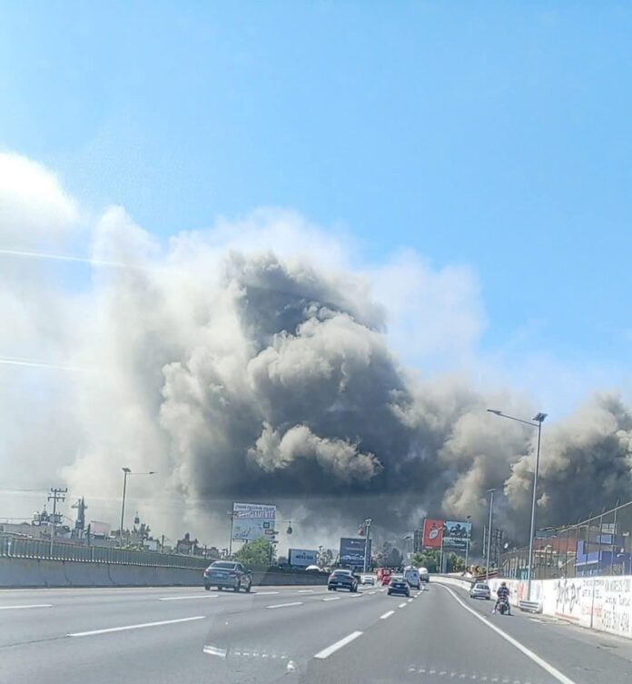 Ciudad de México, 21 de octubre de 2025.— Una columna de humo de gran magnitud se registró esta mañana sobre la autopista México-Pachuca, antes de llegar a la zona de Indios Verdes, debido a un incendio en una fábrica de colchones.