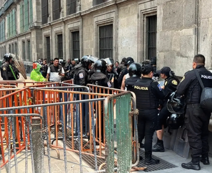 Posteriormente, los manifestantes llegaron a la plancha del Zócalo, demandando una audiencia con el presidente Andrés Manuel López Obrador. Ante la ausencia de respuesta por parte de las autoridades federales, arrojaron cohetones, petardos y vallas hacia las puertas del Palacio, donde se encontraban policías para evitar un posible ingreso.